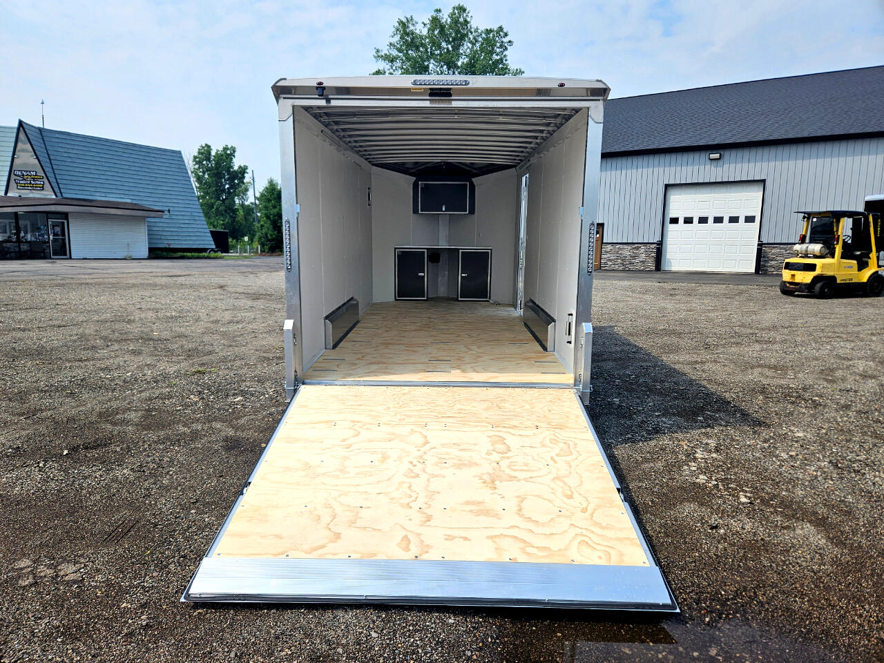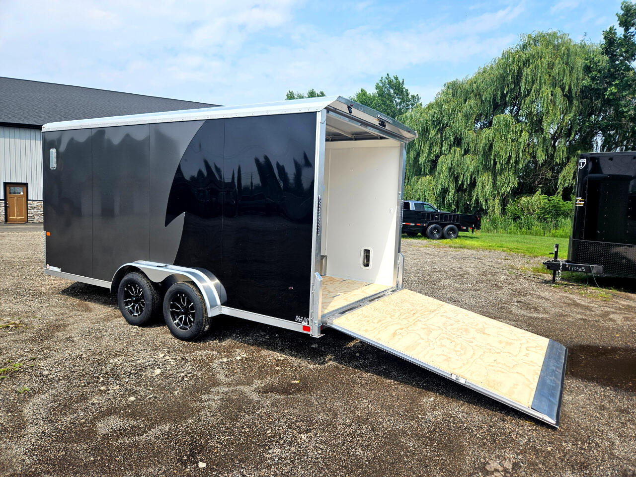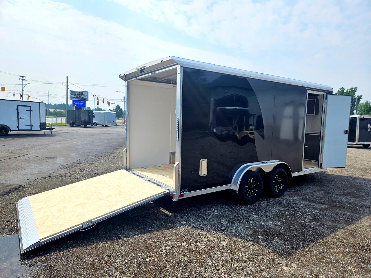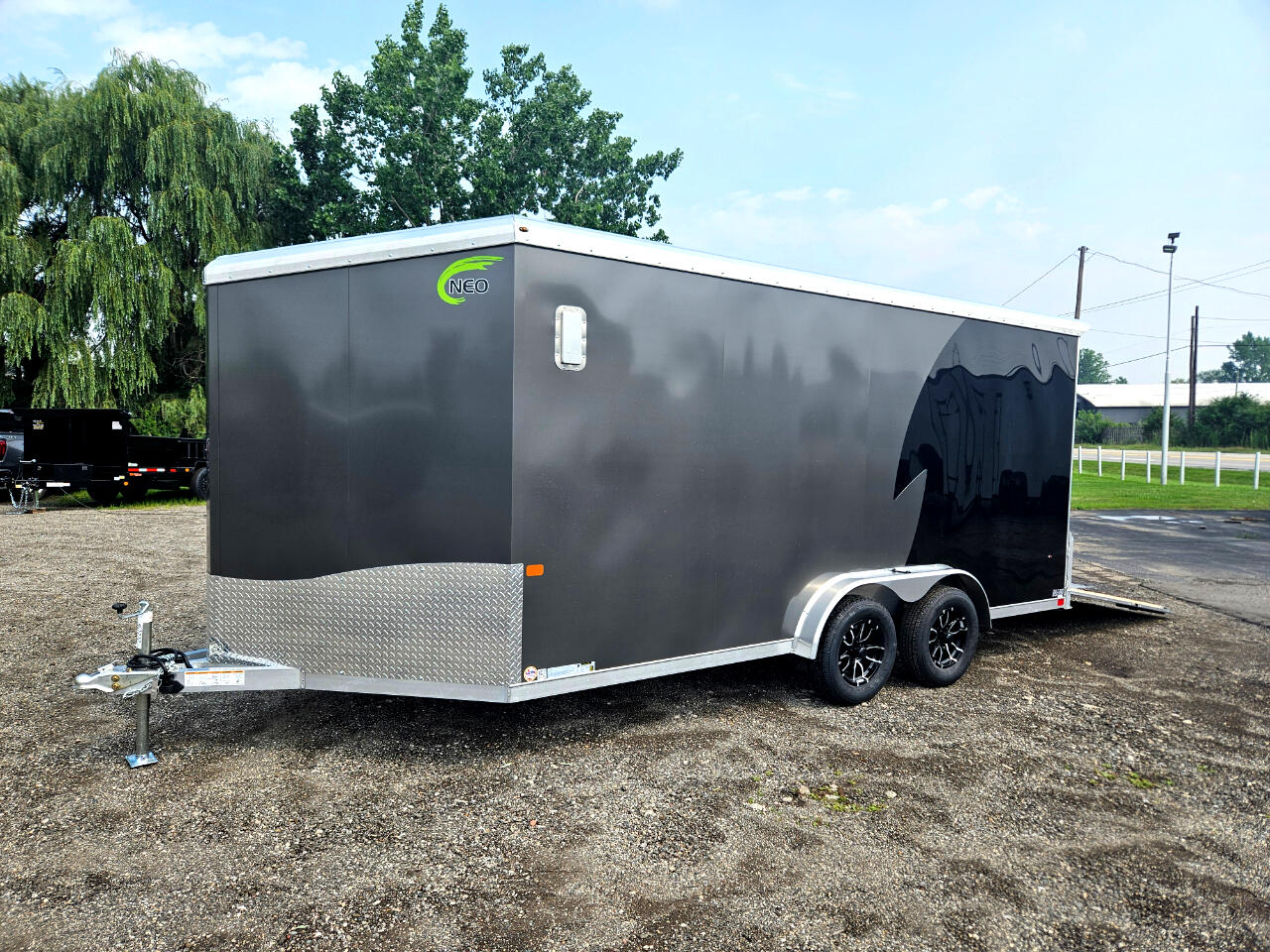 Brand New 2026 Model NEO Aluminum Motorcycle model. Extra height to handle most side x sides too!!! Super high quality build! FREE UPGRADES!!! Wheels & spoiler! *NAM1675TR80 model 7.5x16 *+6" height, 7' interior *CABLE-LESS rear ramp door!!! *Free DT Spoiler upgrade *Free aluminum wheel upgrade *3500lb Torsion axles *Upper and base cabinet units *White vinyl wall upgrade *16" OC framing! *Triple tube tongue *Two 36" LED interior lights *Rear loading light *Salem side air vents-adjustable *Rear drop down stabilizer jacks *Sport Tie Down system w/8 D-Rings