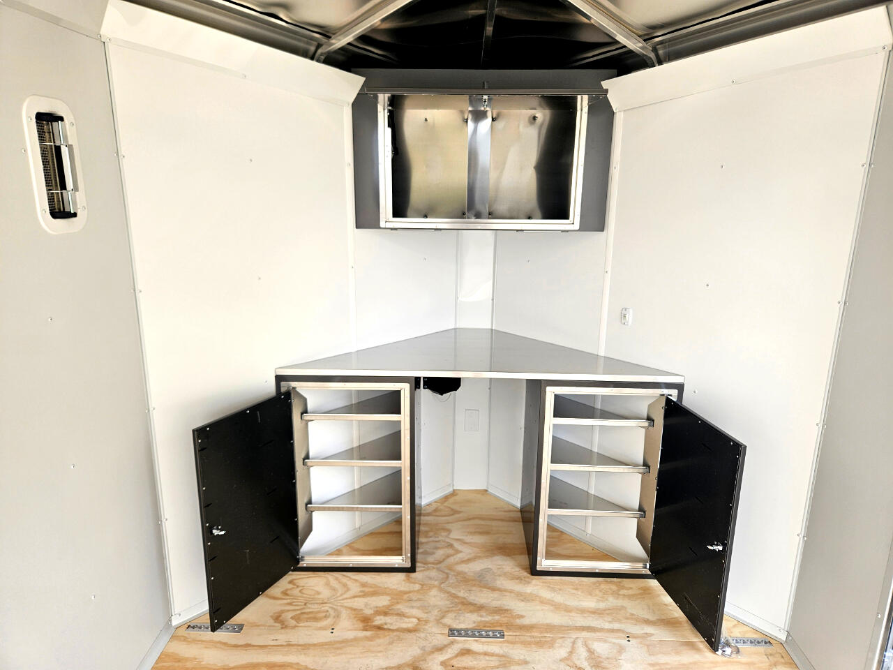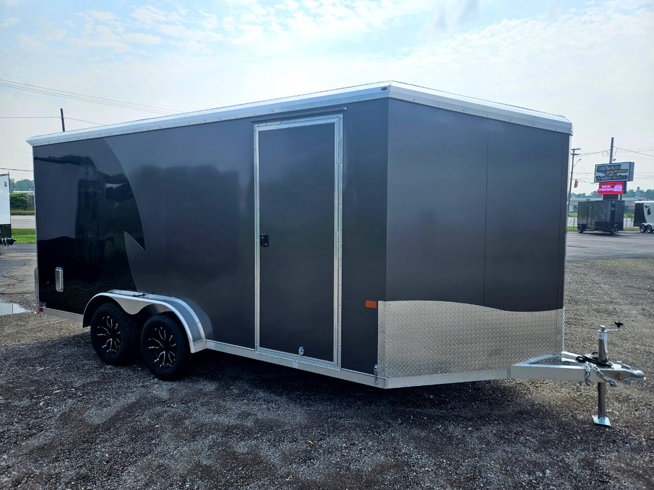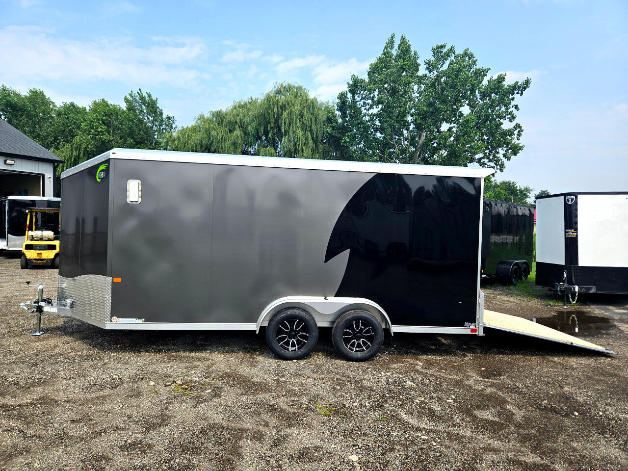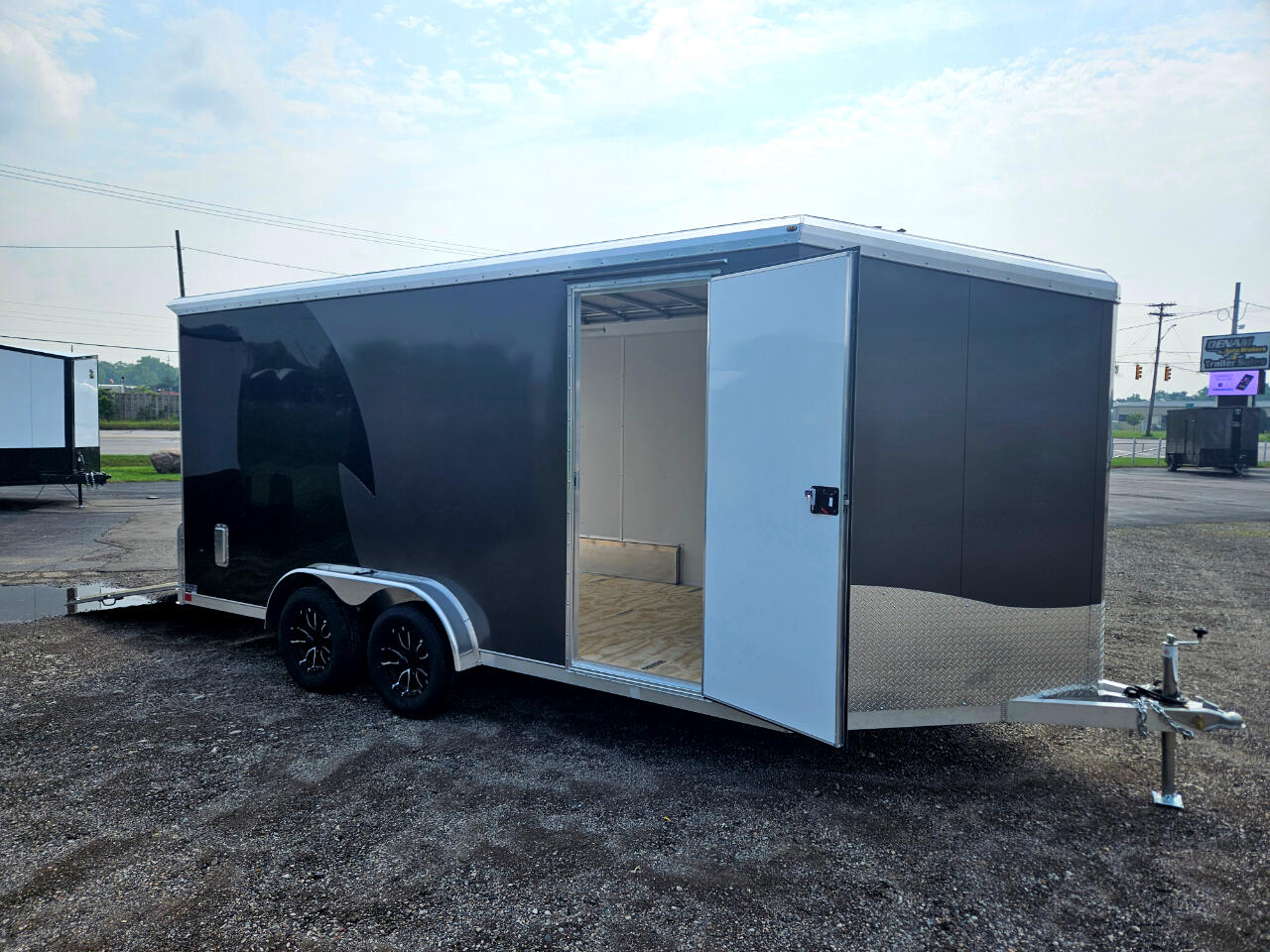 Brand New 2026 Model NEO Aluminum Motorcycle model. Extra height to handle most side x sides too!!! Super high quality build! FREE UPGRADES!!! Wheels & spoiler! *NAM1675TR80 model 7.5x16 *+6" height, 7' interior *CABLE-LESS rear ramp door!!! *Free DT Spoiler upgrade *Free aluminum wheel upgrade *3500lb Torsion axles *Upper and base cabinet units *White vinyl wall upgrade *16" OC framing! *Triple tube tongue *Two 36" LED interior lights *Rear loading light *Salem side air vents-adjustable *Rear drop down stabilizer jacks *Sport Tie Down system w/8 D-Rings