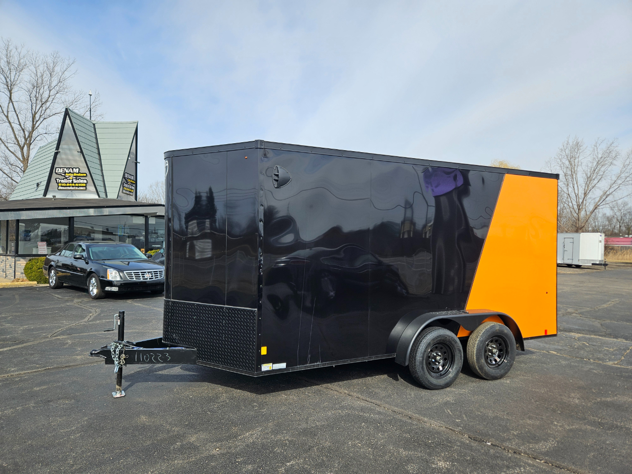 Sharp 2025 Michigan made Interstate-1 trailer! Deluxe torsion axle model. Beefy frame!!! *IFC714TA2 model *Tandem 3500lb Torsion axles *Black & Orange two tone exterior metal *Screwless exterior *ALL 16" on center framing!!! *32" side door *Keyed entry paddle latch/deadbolt *3/4" floor and ramp board *3/8" plywood walls *Side air vents *6" I beam subframe *Electric brakes to all 4 hubs *.030 exterior metal